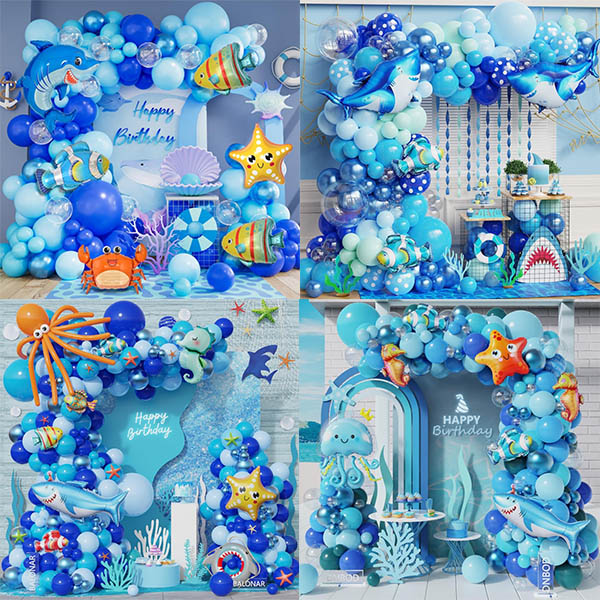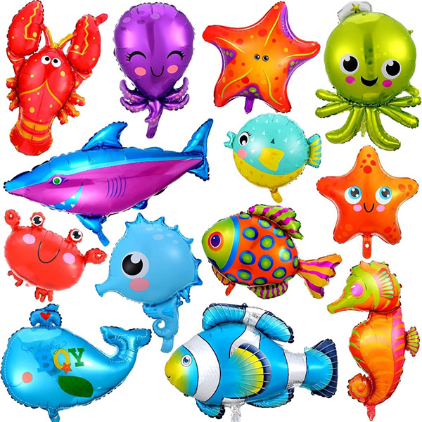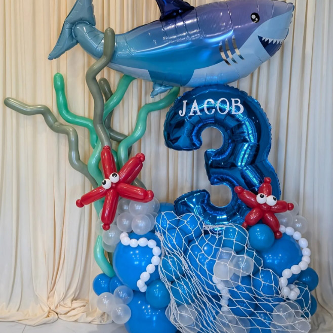 2. Folienballon:Die Ballongirlande mit Haifischfolienballons ist dieses Paket mit Folienballons mit verschiedenen Cartoon -Marine -Kreaturen wie Haien, Seestern, Quallen und Seepferdchen ausgestattet. Darüber hinaus können wir auch kundenspezifische Folienballons für Sie entwerfen, um Ihr Muster zu erzeugen, um eine einzigartige Ballongirlande mit Haiffolienballons zu erzeugen.