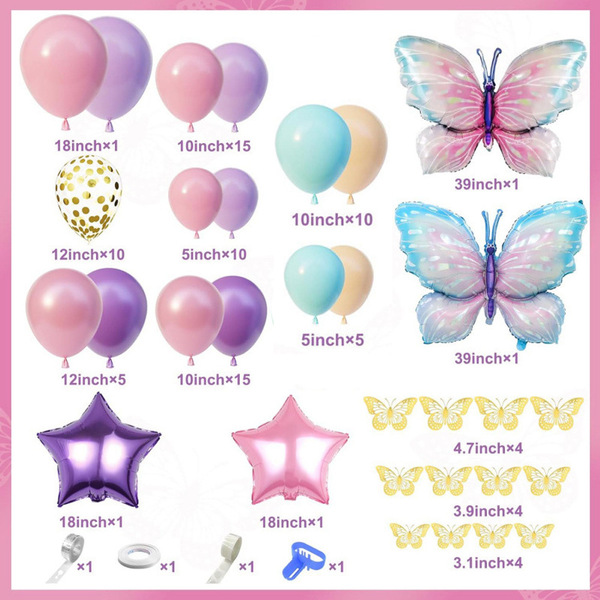 Das Schmetterlings-Ballongirlanden-Set enthält hauptsächlich Latexballons, sie sind in verschiedenen Größen erhältlich (5 Zoll, 10 Zoll, 12 Zoll und 18 Zoll). Ihre Farben werden normalerweise von Rosa, Blau, Lila usw. dominiert. Um den Schichteffekt des Kits zu verstärken, können Sie auch transparente Latexballons und Konfetti-Latexballons sehen. Als Thema des Kits sind auch die Schmetterlingsfolienballons unverzichtbar. Die meisten ihrer Farben sind leuchtend (blau/rosa/lila...) und die durchschnittliche Größe liegt zwischen 18 und 30 Zoll (mit Sondergrößen erhältlich). Darüber hinaus haben sie ein sehr realistisches Aussehen, das fast lebensecht wirkt.