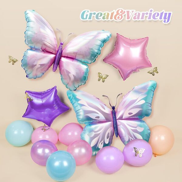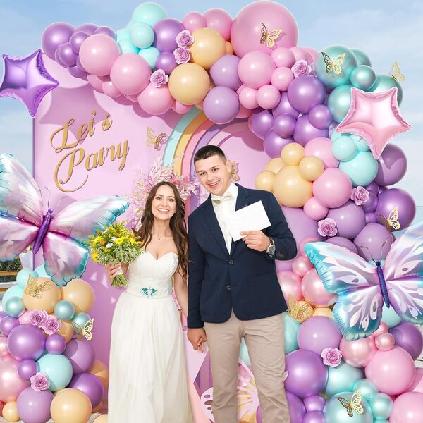 Schmetterlings-Ballonbogen-Set: Das Bogen-Set ist farbenfroh und auffällig, es besteht aus verschiedenen Folienballons und Latexballons. Fügen Sie beim Anordnen eine Hintergrundtafel mit Mustern und unterschiedlichem Text hinzu und umgeben Sie dann die Luftballons darum. Es ist der Schöpfer der Atmosphäre auf der Veranstaltung. Das Fotografieren davor wird sehr schön aussehen.