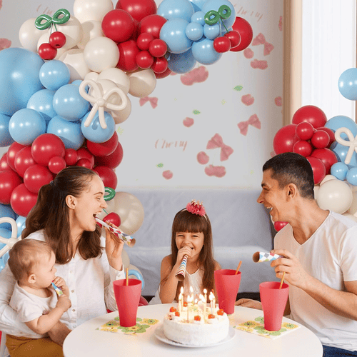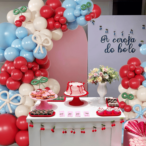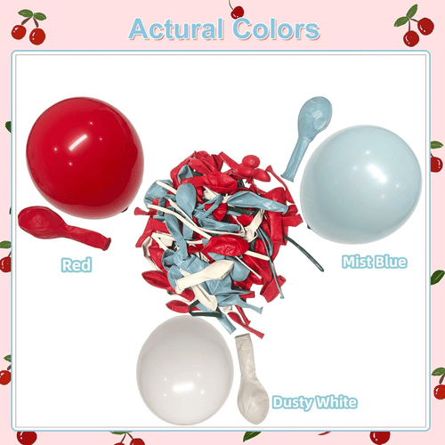 Der Kirschblüten-Ballonbogen wird mit verschiedenen Latexballons geliefert, darunter runder Latexballon und langer Latexballon. Der gesamte Stil des Kits ist positiv und niedlich und wurde von Kunden auf der ganzen Welt geliebt. Die Farben des runden Latexballons sind Rot, Staubweiß und Nebelblau. Und für lange Latexballons gibt es Nebelblau, Staubweiß und Grün. Die langen Latexballons werden für den Fliege- und Kirschstil verwendet.