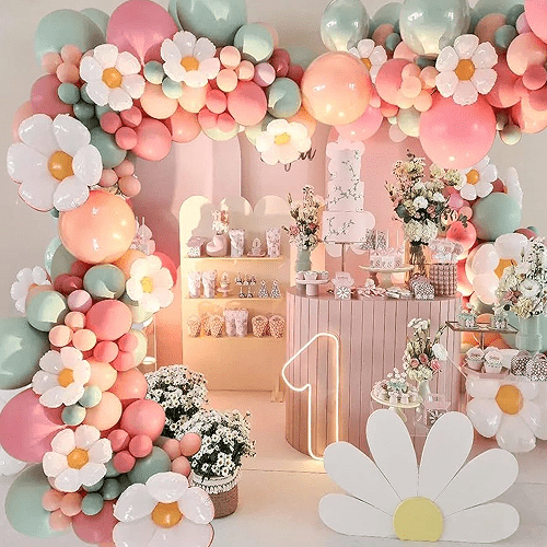 Geburtstagsfeier: Die Gänseblümchen-Ballongirlande kann als Hintergrunddekoration für Geburtstagsfeiern verwendet werden, eignet sich für die Organisation von Kinder- oder Frauengeburtstagen und schafft eine fröhliche Atmosphäre.