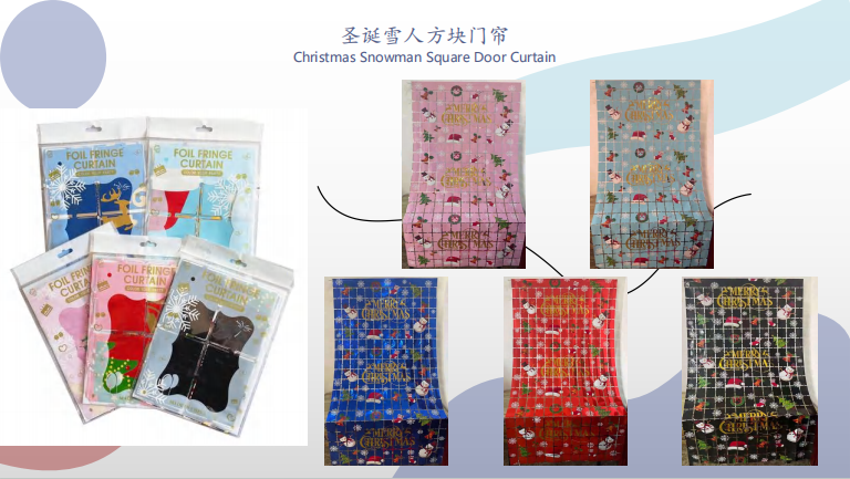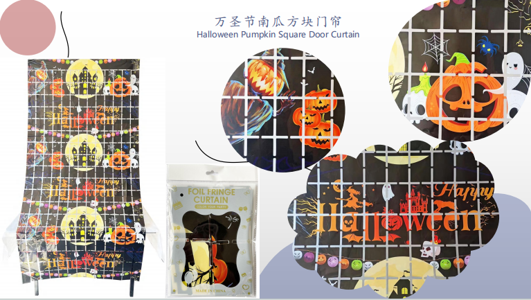 Wie ein grünes und rotes Folienvorhang mit Weihnachtsmotiven, schwarzer und orangefarbener Folienvorhang mit Halloween-Themen und Folienvorhang mit Kürbissen, Fledermäusen, Spinnen und anderen Formen, die für die Feriendekoration in Häusern, Einkaufszentren, Bars und anderen Orten verwendet werden können.