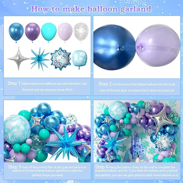 Das Frozen-Ballongirlanden-Set hat einen reichhaltigen und farbenfrohen Inhalt. Es umfasst Luftballons in verschiedenen Größen und Mengen. Dieses Design verstärkt nicht nur den Eindruck der Schichtung der Dekoration. Es stellt außerdem sicher, dass Benutzer sie flexibel anpassen können. Es passt sich an Räume unterschiedlicher Größe an. Es funktioniert für kleine Familientreffen im Innenbereich. Es eignet sich auch für große Partys im Freien. Das kleine Set kann die Ecke eines Kinderzimmers schmücken. Es erschafft eine kleine Märchenwelt vor dem Schlafengehen. Das große Set wird in Bankettsälen verwendet. Es entsteht ein immersiver Eis- und Schneebogen. Gäste steigen ein und starten sofort in ein „Eis- und Schneeabenteuer“. Es realisiert wirklich einen Satz Dekorationen für verschiedene Szenen.