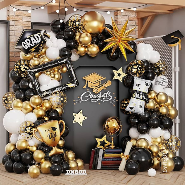 Bei einer Zeremonie zur Feier Ihrer Erfolge in Ihrer akademischen Phase ist es perfekt, Ihre Abschlussfeier mit einem Folienballon mit Ballongirlande zu dekorieren. Diese Ballongirlande verwendet den klassischen Farbton der Abschlussfeier, wie Schwarz, Gold und Weiß. Alle Latexballons in diesem Ballongirlanden-Set bestehen aus Naturlatex und werden streng getestet und für eine sichere Verwendung ausgewählt. Kombinieren Sie es mit metallischen Latexballons und goldenen Konfettiballons, um ihm mehr Glanz zu verleihen. Darüber hinaus fügen wir eine Vielzahl ikonischer Abschlusselemente hinzu, wie z. B. einen Explosionsstern-Ballon, einen Folienballon für Abschlussurkunden, einen Folienballon für Trophäen, einen Folienballon für einen Junggesellenhut und einen Folienballon mit Fotorahmen, um eine lebendige und attraktive Abschlussatmosphäre für Ihre Party zu schaffen. Darüber hinaus unterstützen wir auch die kostenlose Personalisierung der Ballongirlande mit Graduierungsfolienballon der Verpackung und Abdeckung. Sie können uns Ihr Logo oder den Inhalt senden, den Sie anpassen möchten. Wir verfügen über eine professionelle Designabteilung, die für Sie den Verpackungseffekt gestaltet, der zu Ihnen gehört, und es fallen keine zusätzlichen Kosten an, um Ihnen zu helfen, wettbewerbsfähiger auf dem Markt zu sein und Ihre Markenmerkmale hervorzuheben.