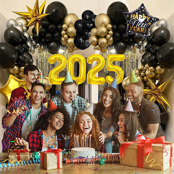 Dieses Set zum Thema Neujahr ist in den Grundfarben Schwarz und Gold gehalten. Das schwarz-goldene Ballongirlanden-Set eignet sich perfekt für Silvesterpartys, Karneval, Feiertagstreffen oder jede andere Mottoparty und ist ein Muss. Sobald es zusammengebaut ist, wird es auf Ihrer Party umwerfend aussehen und nicht nur einen festlichen Touch verleihen, sondern auch einenHintergrund für Fotos mit Freunden und Familie und verleiht Ihrer Neujahrsdekoration einen Hauch von Spaß und festlicher Stimmung.
