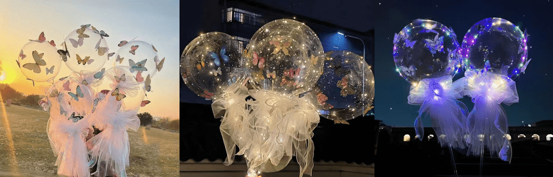 Der Bobo-Ballon selbst ist transparent und schlicht, was in hohem Maße mit der lichtdurchlässigen Flexibilität des hohlen Schmetterlingsaufklebers übereinstimmt. Der Hauptzweck des Aufklebers besteht darin, den eintönigen Ballon zu einem Schmetterlingstanz-Hängeball aufzuwerten und den Ballon durch die dreidimensionale Form des Schmetterlings und den Licht- und Schatteneffekt zum Mittelpunkt der Szene zu machen. Kindergeburtstagsfeier, Geburtstagsfeier für Erwachsene, Empfangsbereich für Hochzeiten, Aktivitäten in Einkaufszentren, Dekoration von Ferienhäusern sind sehr gut geeignet. Nachts kann es auch mit LED-Leuchten kombiniert werden, was sehr auffällig ist.