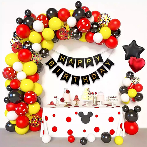 Das Geburtstagsbanner aus Papier ist in leuchtenden Farben und wunderschön gemustert, und der Folienvorhang ist leicht und elegant und verleiht dem gesamten Bogen eine romantische Atmosphäre. Darüber hinaus ist das Design dieses Mickey-Mouse-Ballonbogens einzigartig und eignet sich für Geburtstagsfeiern von Jungen und Mädchen, was die lebhafte Atmosphäre der Szene sofort verbessern kann.