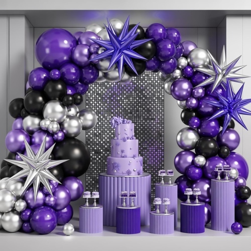 Hochwertige lila und schwarze Luftballons-Girlanden-Sets ermöglichen es Ihnen, schwarze und lila Luftballons zu kombinieren. Sie können schwarze und violette Ballons mit silbernen Ballons oder silbernen Folienballons kombinieren, um die Ballon-Girlanden-Bogen-Sets hervorzuheben. Es ist ideal für Abschlussfeiern, Zeremonien für Erwachsene und andere Meilensteinfeiern und verkörpert ein Ritual, wenn man sich von der Jugend verabschiedet und ins Erwachsensein eintritt. Sie können schwarze und violette Ballons auch mit goldenen Ballons oder goldenen Folienballons kombinieren. Es ist ideal für Anlässe wie Firmenjubiläen und Neueröffnungen von Geschäften, da es Professionalität und Raffinesse ausstrahlt und gleichzeitig ein hochwertiges, seriöses Markenimage vermittelt. Sie können auch mit blauen Luftballons kombiniert werden, um einen futuristischen Look zu kreieren. Diese Ballon-Sets eignen sich besonders gut für Partys mit elektronischen Sport-, Trend- und Science-Fiction-Motiven und bieten eine beeindruckende visuelle Wirkung.