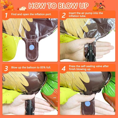 Die Thanksgiving-Folienballons lassen sich ganz einfach aufblasen und verschließen. Sie können zum Aufblasen eine Handpumpe oder eine Elektropumpe verwenden und den Ballon dann mit dem selbstklebenden Kleber verschließen, der sich an der Düse jedes Ballons befindet. Sobald der Ballon versiegelt ist, wird er stabil.