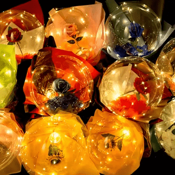 Der Rosen-Bobo-Ballon ist ein kreatives Produkt, das die Rose mit dem Bobo-Ballon kombiniert. Die Rosen werden behandelt, z. B. flauschig und voll geknetet, in einen transparenten Bobo-Ballon gesteckt und dann der Bobo-Ballon aufgeblasen. Anschließend werden die Blumenstange und der Kugelmund mit Klebeband fixiert und ein Kugelhalter mit Lichtlinie angebracht. Die Lichtlinie verfügt außerdem über verschiedene Lichtmodi. Darüber hinaus wird der Ball mit langen Luftballons, Feengarnen, Bändern usw. verziert, damit er schöner und zarter aussieht. Wird hauptsächlich für die Dekoration zum Valentinstag, Geburtstag, Hochzeit und anderen romantischen Anlässen verwendet und kann auch als Geschenk verschenkt werden.