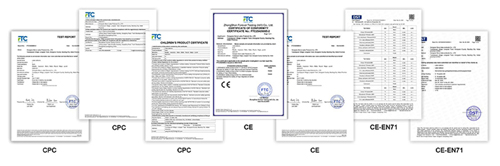 Unser gesamtes Produktsortiment hat die CPC-, CE- und EN71-Zertifizierung sowie andere maßgebliche Zertifizierungen bestanden und entspricht dabei strikt den europäischen und amerikanischen sowie anderen Sicherheitsbestimmungen des Zielmarkts. Diese Qualifikationen können dazu beitragen, dass Ihre Waren den Zoll reibungslos abwickeln und Compliance-Risiken in Überseemärkten vollständig vermieden werden.
