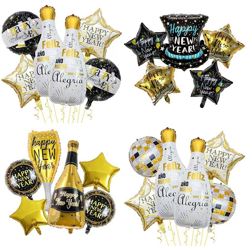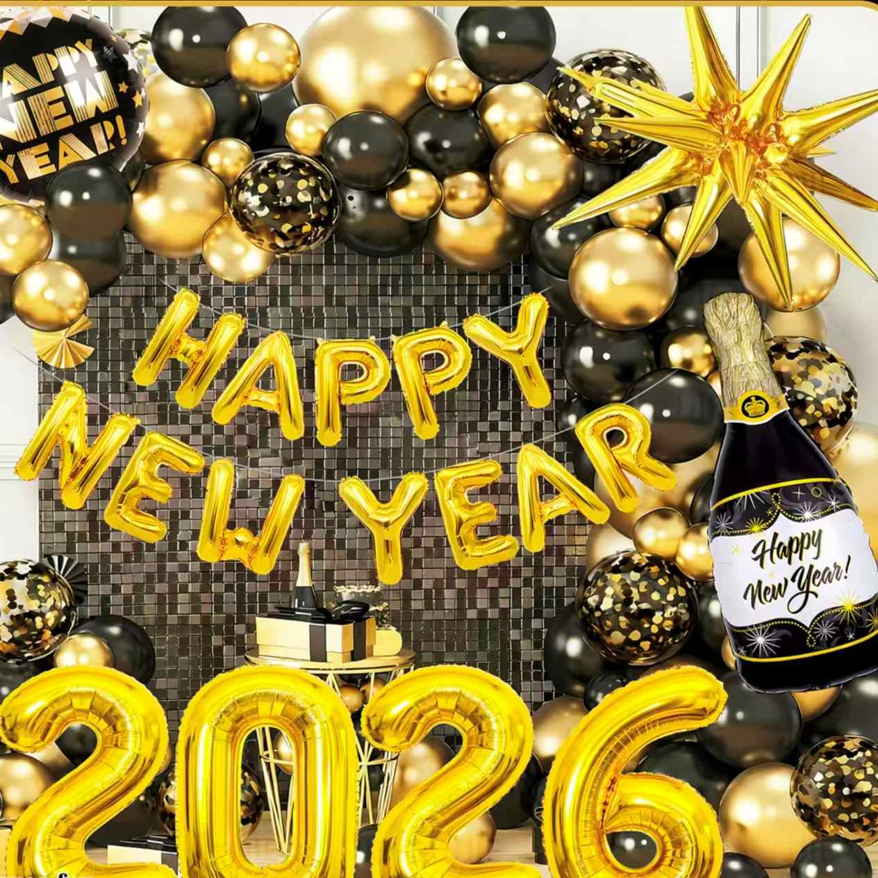 Denken Sie an das Set zum Thema Neujahr. Es gibt Folienballons, die wie Champagnerflaschen aussehen. Es enthält auch „2026“-Zahlenballons, Stern-Dekorationsballons und mehr. Die Hauptfarben sind Schwarz-Gold oder Gold-Weiß. Es ist voller festlicher Neujahrsstimmung. Es lässt sich leicht zu einer luxuriösen und feierlichen Neujahrsparty-Szenerie machen.
