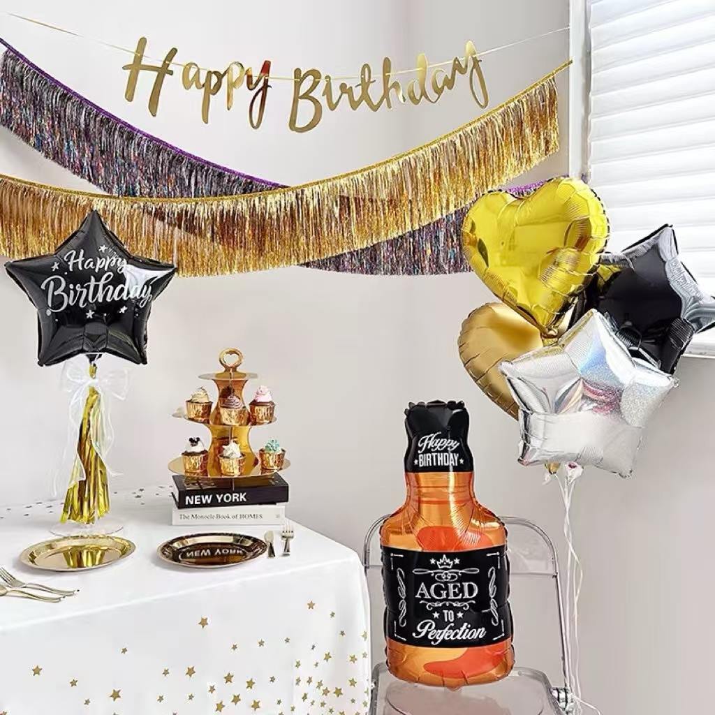Es gibt auch ein Set zum Thema Geburtstag. Die rosafarbenen und süßen Weinflaschenballons bestehen aus herzförmigen Folienballons und „Happy Birthday“-Buchstabenballons und die roségoldene Farbe ist sehr romantisch und warm. Es verleiht der Geburtstagsfeier eine süße Atmosphäre.